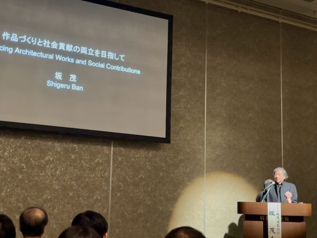 作品の紹介と災害支援の活動紹介の二部構成で、災害支援に関わった経緯や災害活動に対する想いが語られた後、紙管を扱うきっかけになった展覧会の会場構成に始まり、様々な建築とその設計の過程や社会に対する姿勢と共に紹介されました。